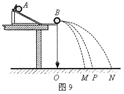 13. 如图9所示,在验证动量守恒定律的实验中,将一个质量为m1的钢球A多次从斜槽轨道上端紧靠固定档板处由静止释放,这个钢球经过斜槽轨道后由水平轨道飞出,在地面上落点的平均位置为P点。然后在水平轨道末端放置一个质量为m2的胶木球B(A、B两球的半径相等),将A球仍然多次从斜槽轨道的同一位置由静止释放,与球B发生碰撞,碰后两球分别落到地面上,根据两球落在地面的痕迹确定两球各自的落地点的平均位置分别为M点和N点。水平轨道末端重锤线指向地面的O点,测得OM=s1,OP=s2,ON=s3。重力加速度为g。