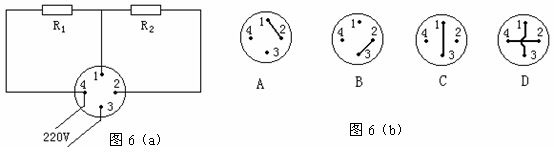 12.有一只家用电熨斗,其电路结构如图6(a)所示,图中1、2、3、4是内部4个接线柱,改变内部接线方式可使电熨斗获得低、中、高三个不同的温度挡。图6(b)是它的四种不同的连线方式,其中能获得低挡温度的连线方式是图6(b)中的 ,能获得高挡温度的连线方式是图6(b)中的 。