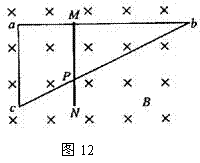 (12分)如图12所示,直角三角形导线框abc固定在匀强磁场中,ab是一段长为2l、总电阻为2R的均匀导线,ac和bc的电阻可不计,ac长度为l。磁场的磁感强度为B,方向垂直纸面向里。现有一段长度为l、总电阻为R的均匀导体杆MN架在导线框上,开始时紧靠ac,然后沿ab方向以恒定速度v向b端滑动,滑动中始终与ac平行并与导线框保持良好接触。当MN滑过的距离为