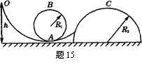 15、(15分)光滑圆形轨道半径R1=25cm,R2=50cm,它们之间又通过光滑轨道连接,质量为m=250g的小球从h=70cm高处无摩擦滑下,在R1轨道内侧运动后经连接轨道进入轨道R2的外侧运动,先后通过了A、B、C三点,求: