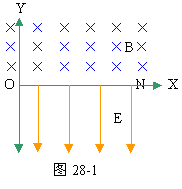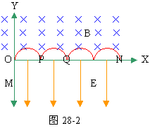 (2)粒子在M点受向上电场力,从静止出发做匀加速运动。在 O点进入匀强磁场后,只受洛仑兹力(方向沿+X轴)做匀速周围运动,经半个周期,回到X轴上的P点,进入匀强电场,在电场力作用下做匀减速直线运动直到速度为零。然后再向上做匀加速运动,在X轴上P点进入匀强磁场,做匀速圆运动,经半个周期回到X轴上的Q点,进入匀强电场,再在电场力作用下做匀减速运动直到速度为零。此后,粒子重复上述运动直到 X轴上的N点,运动轨迹如图28-2所示。