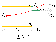 从飞离板到到达筒的偏距:y2=Vyt2=(eE2/m)(L1/V0)(L2/V0)=(eE2L1L2)/(mV02)