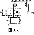 如图33-1所示,线圈abcd每边长l=0.20m,线圈质量m1=0.10kg、电阻R=0.10Ω,砝码质量m2=0.14kg.线圈上方的匀强磁场磁感强度B=0.5T,方向垂直线圈平面向里,磁场区域的宽度为h=l=0.20m.砝码从某一位置下降,使ab边进入磁场开始做匀速运动.求线圈做匀速运动的速度.