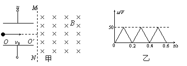 16、(16分)如图所示,两平行金属板间接有图(乙)所示的随时间t变化的电压u,板长l=0.4m,板间距离d=0.2m。在金属板右侧有一边界为MN的匀强磁场,磁感应强度B=5×10-3T,方向垂直纸面向里。现有带电粒子以速度V0=105m/s沿两板中线OO’方向平行金属板射入电场中,磁场边界MN与中线OO’垂直,已知带电粒子的比荷q/m=108c/kg。粒子的重力可忽略不计。在每个粒子通过电场区域的极短时间内,电场可视作是恒定不变的。