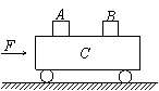 18、(16分)如图所示,质量分别为0.6kg和0.4kg的A、B两物体,放在质量为1kg的足够长的小车C上,A、B相距8cm,它们随车以v0=1.0m/s的速度在光滑的水平面上向右匀速运动,若在小车上加一水平向右的推力F=4N,A、B便在小车上滑动,已知A、B与小车间的动摩擦因数分别为μA=0.2,μB=0.1,g取10m/s2,