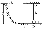 20.如图所示,球A无初速地沿光滑圆弧滑下至最低点C后,又沿水平轨道前进至D与质量、大小完全相同的球B发生动能没有损失的碰撞。B球用长L的细线悬于O点,恰与水平地面切于D点。A球与水平地面间摩擦系数m=0.1,已知球A初始高度h=2米,CD=1米。问: