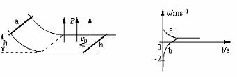 23、如图所示,两足够长且电阻不计的光滑金属轨道,间距为d=100cm,在左端斜轨道部分高h=1.25m处放置一金属杆a,斜轨道与平直轨道以光滑圆弧连接,在平直轨道右端放置另一金属杆b,杆a、b电阻Ra=2Ω,Rb=5Ω,在平直轨道区域有竖直向上的匀强磁场,磁感强度B=2T。现杆b以初速度v0=5m/s开始向左滑动,同时由静止释放杆a,杆a由静止滑到水平轨道过程中,通过杆b的平均电流为0.3A;从a下滑到水平轨道时开始计时,a、b杆运动图象如图所示(以a运动方向为正),其中ma=2kg,mb=1kg,g=10m/s2,求(1)杆a落到水平轨道瞬间杆a的速度v;(2)杆a 在斜轨道上运动的时间;(3)杆a在水平轨道上运动过程中通过的电量;(4)在整个运动过程中杆b上产生的焦耳热。