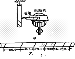 (7分)如图6甲所示,用包有白纸的质量为1.00kg的圆柱棒替代纸带和重物,蘸有颜料的毛笔固定在电动机上并随之转动,使之替代打点计时器。当烧断悬挂圆柱棒的线后,圆柱棒竖直自由下落,毛笔就在圆柱棒面上的纸上画出记号,如图6乙所示,设毛笔接触棒时不影响棒的运动。测得记号之间的距离依次为26.0mm、42.0mm、58.0mm、74.0mm、90.0mm、106.0mm,已知电动机铭牌上标有“1440r/min”字样,由此验证机械能守衡。根据以上内容。回答下列问题: