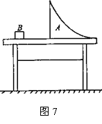 (7分)如图7所示,水平桌面上有斜面体A、小铁块B。斜面体的斜面是曲面,由其截面图可以看出曲线下端的切线是水平的。现提供的实验测量工具只有:天平、直尺。其他的实验器材可根据实验要求自选。请设计一个实验,测出小铁块B自斜面顶端由静止下滑到低端的过程中,小铁块B克服摩擦力做的功,要求: