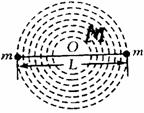 的不同,目前有一种流行的理论认为,在宇宙中可能存在一种望远镜观测不到的暗物质,作为一种简化模型,我们假设在已这两个星体连线为直径的球体内均匀分布着这种暗物质,这样每个星体除受到另一个星体的引力作用,还受到如图所示的以两星体连线中点O为球心直径为L的暗物质构成的球体的引力作用,不考虑其它暗物质影响,请根据这一模型和上述观测结果确定该暗物质球体的质量M以及密度ρ。