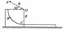 24、(20分)如图所示,半径R=0.8m的光滑1/4圆弧轨道固定在光滑水平上,轨道上方的A点有一个可视为质点的质量m=1kg的小物块。小物块由静止开始下落后打在圆弧轨道上的B点但未反弹,在该瞬间碰撞过程中,小物块沿半径方向的分速度即刻减为零,而沿切线方向的分速度不变,此后小物块将沿着圆弧轨道滑下。已知A点与轨道的圆心O的连线长也为R,且AO连线与水平方向的夹角为30°,C点为圆弧轨道的末端,紧靠C点有一质量M=3kg的长木板,木板的上表面与圆弧轨道末端的切线相平,小物块与木板间的动摩擦因数