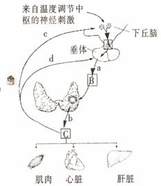 Ⅱ、(12分)右下图示正常人受到寒冷刺激时的部分调节过程。A、B、C表示调节物质,a、b、c、d表示调节效应。请据图分析回答([ ]内填物质编号):