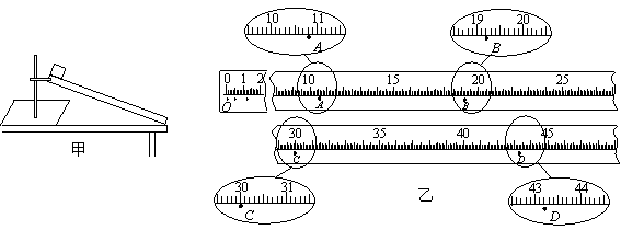 12.(10分)用铁架台将长木板倾斜支在水平桌面上,组成如图甲所示装置(示意图),测量木块沿斜面下滑的加速度。所提供的仪器有长木板、木块、打点计时器(含纸带)、学生电源、米尺、铁架台及导线、开关等。图乙是打点计时器打出的一条纸带,纸带旁还给出了最小刻度为1mm的刻度尺,刻度尺的零刻度线与O点对齐。A、B、C、D为四个相邻的计数点,相邻计数点间还有四个点未标出。打点计时器所用交流电源的频率是50Hz。