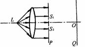 从点光源L发出的白光,经过透镜后成一平行光束,垂直照射到挡光板P上,板上开有两条靠得很近的平行狭缝S1,S2,如图所示,在屏Q上可看到干涉条纹,图中O点是屏Q上与两狭缝等距离的一点,则: