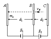 19.(本题8分)在金属板AB间、BC间分别接有电源E1和E2,已知金属板AB间的距离为d1=20cm,BC间的距离为d2=10cm。如图所示,在A板右侧的附近有一个电子,(其质量为me,电荷量e为已知)由静止开始在电场力的作用下,能够穿过B板上的小孔向右运动,……。问:⑴若电源电动势E1=6V,为了使电子能够达到C板,那么电源的电动势E2的取值范围是什么?⑵若电源电动势E1=6V,E2=9V,则电子向右运动的最大速率(运算结果可用me和e来表达)是多少?电子离开A板的最大距离是多少?