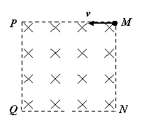如图,MNPQ为真空中一个边长为l正方形匀强磁场区域的边界,一质量为m带电量为+q粒子(不计重力),以速度v沿垂直于磁场的方向从M点进入磁场区域,恰能从NQ边的中点离开磁场区域,求匀强磁场的磁感应强度B的大小。