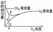 下图表示某植物幼根的细胞呼吸过程中,O2的吸收量和CO2的释放量随环境中O2浓度的变化而变化的曲线,其中线段XY=YZ,则在氧浓度为a时