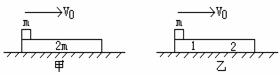 将质量为2m的长木板静止地放在光滑的水平面上,如图甲所示,以质量为m的小铅块(可视为质点)以水平初速度n0由木板的左端恰能滑至木板的右端与木板相对静止,铅块运动中所受的摩擦力始终不变。现在将木板分成长度与质量均相等的两段(1,2)后紧挨着仍放在此水平面上,让小铅块仍以相同的速度v0由木板的左端开始滑动,如图乙所示,则下列判断正确的是