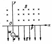 (18分)如图所示,在xOy平面上内,x轴上方有磁感应强度为B,方向垂直xOy平面指向纸里的匀强磁场,x轴下方有场强为E、方向沿y轴负方向的匀强磁场,现将一质量为m,电量为e的电子,从y轴上M点由静止释放,要求电子进入磁场运动可通过x轴上的P点,P点到原点的距离为L.