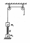 (20分)如图,质量为m1的物体A经一轻质弹簧与下方地面上的质量为m2的物体B相连,弹簧的劲度系数为K,A、B都处于静止状态。一条不可伸长的轻绳绕过轻滑轮,一端连物体A,另一端连一轻挂钓。开始时各段绳都处于伸直状态,A上方的一段绳沿竖直方向。现在挂钩上挂一质量为m3的物体C并从静止状态释放,已知它恰好能使B离开地面但不继续上升。若将C换成另一个质量为(m1+m3)的物体D,仍从上述初位置由静止状态释放,则这次B刚离开地时D的速度大小是多少?已知重力加速度为g.