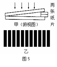 例3.(2003年上海高考试题)劈尖干涉是一种薄膜干涉,其装置如图5甲所示,将一块平板玻璃放置在另一平板玻璃之上,在一端夹入两张纸片,从而在两玻璃表面之间形成一个劈形空气薄膜。当光垂直入射后,从上往下看到的干涉条纹如图乙所示。干涉条纹有如下特点:(1)任意一条明条纹或暗条纹所在位置下面的薄膜厚度相等;(2)任意相邻明条纹和暗条纹所对应的薄膜厚度差恒定。现若在图甲装置中抽去一张纸片,则当光垂直入射到新的劈形空气薄膜后,从上往下观察到的干涉条纹( )
