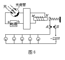 例4.光电效应把光信号转变为电信号,动作非常迅速灵敏,因此,在科学中得到了广泛的应用,光电管就是适应这种需要而制成的。如图6是一个用光电管自动控制路灯的电路图。