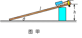 (6分)某组同学借鉴“测定匀变速运动的加速度”实验方法,设计了如下用光滑斜面测定重力加速度的实验,如图甲所示。他们用垫块垫高光滑长木板的一端,使之成为斜面,改变垫块厚度可改变斜面的倾角q 。利用打点计时器所打出的纸带,测出几组对应不同倾角q 时,小车沿斜面下滑的加速度a,将测得的数据记录于右表中,其中l为斜面的长度,h为对应不同倾角q 时斜面一端的高度。求: