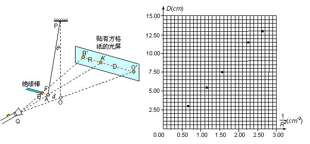 体小球B分别带上异种电荷,保持B和A在平行于光屏的同一水平线上。使小球B逐渐靠近A,由于带电小球之间的静电引力,A将向B靠近,使丝线与竖直方向成q 角(实验过程中确保q < 5°)。A、B因手电筒照射而在光屏上的投影分别为A’、B’。设:OA = d ,AB = r,O’A’ = D,A’B’ = R。多次改变A、B之间的距离,将测得的一系列数据记录于右表中。请
