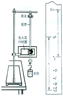 ⑵图乙是按正确操作顺序操作打出的一条纸带,图中O是打出的第一个点迹,A、B、C、D、E、F、G是依次打出的点,量出OF间的距离为h=21.90cm,EG间的距离s=16.50cm.已知电火花计时器的打点频率是f=25Hz.