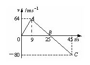 (8分)一空间探测器从某一星球表面竖直升空,假设探测器质量恒为1500 kg,发动机推动力F为恒力,若探测器升空过程中发动机突然关闭,其速度随时间的变化情况如图所示,图线上A、B、C三点对应的时刻分别为9 s、25 s和45 s。已知该星球表面没有空气。试求:(1)求探测器在该星球表面达到的最大高度H;(2)求该星球表面的重力加速度;(3)求发动机的推动力F大小。