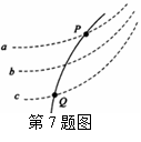 如图所示,虚线a、b、c代表电场中三个等势面,相邻等势面之间的电势差相等,即Uab = Ubc,实线为一带正电的质点仅在电场力作用下通过该区域时的运动轨迹,P、Q是这条轨迹上的两点,据此可知