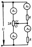 如图,总电压U保持不变争滑动变阻器总电阻为2R.滑动触片位于变阻器中点O时,四个理想电流表A1、A2、A3、A4上的示数相同,且为I0,当滑动触片移到变阻器的端点O’时: