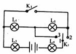四个电灯泡连接如图所示,当将K2断开,Kl接通1→2时.L1最亮,L2与L4最暗且亮度相同;当将K1接通1→3,K2闭合时,则: