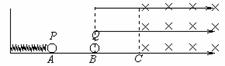 5.如图,光滑水平面上带电量为q、质量为m的小球P靠在一劲度系数为k的轻弹簧的右端。现将弹簧向左压缩长度为L后自A点静止释放小球P,小球P运动到B处时恰与静止的不带电的相同小球Q相碰并粘在一起,进入水平向右的匀强电场中。C点右侧是垂直纸面向里的匀强磁场,小球运动到C点时,电场突然变为竖直向上,但大小不变。此后物体开始在竖直平面内作圆周运动,到达最高点时撤去电场,小球正好又落回B点。已知AB=BC=L,弹簧的弹性势能与其形变量x的关系是Ep=