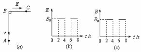 的方向),电场变化如图(b)中E-t图象,磁感应强度变化如图(c)中B-t图象.在A点,从t=1 s(即1 s)开始,每隔2 s,有一个相同的带电粒子(重力不计)沿AB方向(垂直于BC)以速度v射出,恰能击中C点,若