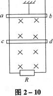 16.(13分)如图2-10所示,足够长的两根相距为0.5m的平行光滑导轨竖直放置,导轨电阻不计,磁感应强度B为0.8T的匀强磁场的方向垂直于导轨平面。两根质量均为0.04kg、电阻均为0.5Ω的可动金属棒ab和cd都与导轨接触良好,导轨下端连接阻值为1Ω的电阻R,金属棒ab用一根细绳拉住,细绳允许承受的最大拉力为0.64N。现让cd棒从静止开始落下,直至细绳刚被拉断,此过程中电阻R上产生的热量为0.2J,求: