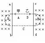 如图所示,ab和cd为两条相距较远的平行直线,ab的左边和cd的右边都有磁感应强度为B、方向垂直纸面向里的匀强磁场,虚线是由两个相同的半圆及和半圆相切的两条线段组成。甲、乙两带电体分别从图中的A、D两点以不同的初速度开始向两边运动,轨迹正好和虚线重合,它们在C点碰撞后结为一体向右运动,若整个过程中重力不计,则下面说法正确的是 ( )