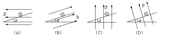 8、质量为m的金属导体棒置于倾角为θ的导轨上,棒与导轨间的动摩擦因数为μ,当导体棒通以垂直纸面向里的电流时,恰能在导轨上静止。如图所示的四个图中,标出了四种可能的匀强磁场方向,其中棒与导轨间的摩擦力可能为零的是 ( )