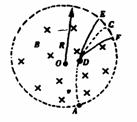 如图所示,在一个半径为R的圆形区域内存在着匀强磁场,磁场方向垂直于圆面向里。一个带电粒子从磁场边界的A点以指向圆心O的方向进人磁场区域内,粒子将做圆周运动到达磁场边界的C点,但在粒子经过D点时,恰好与一个原来静止在该点的不带电的粒子碰撞后结合在一起形成新粒子,关于这个新粒子的运动情况,以下判断正确的是