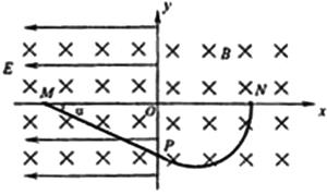 3、、如图所示,坐标系xoy位于竖直平面内,所在空间有沿水平方向垂直于纸面向里的匀强磁场,磁感应强度大小为B,在x<0的空间内还有沿x轴负方向的匀强电场,场强大小为E。一个带正电的油滴经图中x轴上的M点,沿着直线MP做匀速运动,过P点后油滴进入x>0的区域,图中a=30°.要使油滴在x>0的区域内做匀速圆周运动,需在该区域内加一个匀强电场。若带电油滴做匀速圆周运动时沿