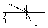 在折射率为n、厚度为d的玻璃平板上方的空气中有一点光源S,从S发出的光线SA以角度θ入射到玻璃板上表面,经过玻璃板后从下表面射出,如右图所示。若沿此光线传播的光从光源到玻璃板上表面的传播时间与在玻璃板中的传播时间相等,点光源S到玻璃上表面的垂直距离L应是多少? (96)