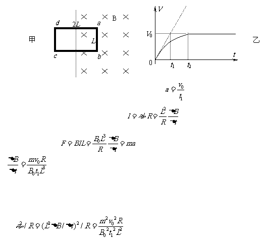 1、有界匀强磁场区域如图甲所示,质量为m、电阻为R的长方形矩形线圈abcd边长分别为L和2L,线圈一半在磁场内,一半在磁场外,磁感强度为B0。t0=0时刻磁场开始均匀减小,线圈中产生感应电流,在磁场力作用下运动, V-t图象如图乙,图中斜向虚线为过0点速度图线的切线,数据由图中给出,不考虑重力影响,求: