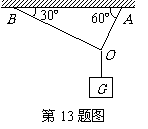 (15分)如图所示,已知轻绳AO最多能承受150N的拉力,轻绳OB最多能承受100N的拉力,则在O点最多能挂多重的重物?