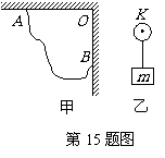 (15分)如图甲所示,将一条轻而柔软的细绳,一端固定在天花板上的A点,另一端固定在竖直墙上的B点,A和B到O点的距离相等,绳长是OA的两倍。图乙为一质量和半径可忽略的动滑轮K,滑轮下悬挂一质量为m的重物,设摩擦力可忽略.现将动滑轮和重物一起挂到细绳上,在达到平衡时,绳所受的拉力多大?若B点稍微向上或向下移动一些,绳所受的拉力如何变化?