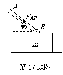 (15分)工程力学中常出现“自锁现象”:如图所示,一机械是由一连杆AB与滑块m用铰链相连。只要AB与m所在平面间夹角q 大于某个值,则无论连杆AB对滑块施加多大力的作用,都不可能使之滑动,且FAB越大,滑块越稳定。为避免滑块产生这种“自锁现象”,q 应满足什么条件?设滑块与平面间动摩擦因数为m。