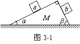 如图3-1所示,一质量为M的楔形木块放在水平桌面上,它的顶角为90°,两底角为α和β;a、b为两个位于斜面上质量均为m的小木块。已知所有接触面都是粗糙的。现发现a、b沿斜面匀速下滑,而楔形木块静止不动,这时楔形木块对水平桌面的压力等于:( )