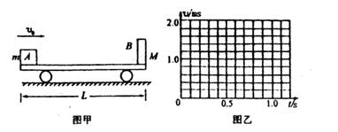 18.(10分)如图甲所示小车B静止在光滑水平面上,一个质量为m的铁块A(可视为质点),以水平速度v0=4.0m/s滑上小车B的左端,然后与右端挡板碰撞,最后恰好滑到小车的左端,已知M/m=3:1,小车长L=1m.并设A与挡板碰撞时无机械能损失,碰撞时间忽略不计,g取10m/s2,求: