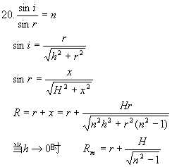 如图所示水平面上有一个半径为r的圆形木板,在圆心的正上方h处有一个点光源、光线射入水中后,在水底平面上形成半径为R的圆形阴影。水深为H,水的折射率为n。当h发生变化时,求证明影的最大半径为: