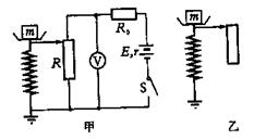 18.图甲是某研究性学习小组自制的电子秤原理图,利用电压表的示数来指示物体的质量。托盘与电阻可忽略的弹簧相连,托盘与弹簧的质量均不计。滑动变阻器的滑动端与弹簧上端连接,当盘中没有放物体时,电压表示数为零。设变阻器总电阻为R,总长度为L,电源电动势为E,内阻为r,限流电阻阻值为R0,弹簧劲度系数为k,若不计一切摩擦和其他阻力。