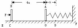 (16分)如图,EF为一水平面,O点左侧是粗糙的,O点右侧是光滑的。一轻质弹簧右端与墙壁固定,左端与质量为m的小物块A相连,A静止在O点,弹簧处于原长状态。质量为m的物块B在大小为F的水平恒力作用下由C处从静止开始向右运动,已知物块B与EO面间的滑动摩擦力大小为F/4, 物块B运动到O点与物块A相碰并一起向右运动(设碰撞时间极短),运动到D点时撤去外力F.已知CO=4s,OD=s.试求撤去外力后: